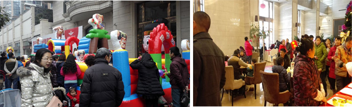 售樓部外那座“從天而降”的童話城堡,著實吸引著孩子們的目光。許多小孩拖著家長,迫不及待的躍入這個可愛的移動城堡中打鬧嬉戲,活力十足的感受著新年的喜悅。家長們似乎也沉浸其中,樂此不疲的看著孩子們嬉笑追逐。當(dāng)然光有童趣是不夠的,喜樂會還帶來了傳統(tǒng)的中國結(jié)DIY,熱情的工藝老師們正悉心的指導(dǎo)熱心的市民如何去編制這美美的中國結(jié)。當(dāng)然你也可以突發(fā)奇想,做一個你心目中的時尚中國結(jié)。一位老婆婆就正借此機會,用她的巧手展示著她高超驚人的編織技藝,引得圍觀人群贊不絕口。紅紅的中國結(jié),也給這寒冷的第一天帶來了陣陣的暖意。