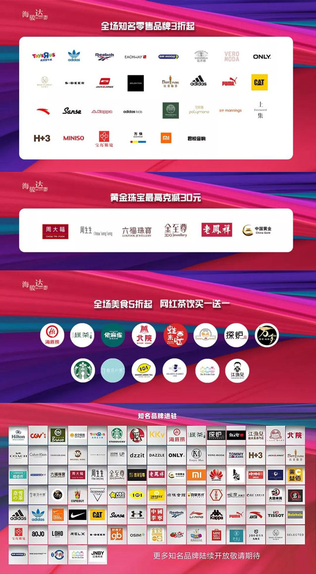 除了各種活動(dòng)外,海駿達(dá)城在開(kāi)放當(dāng)天還聯(lián)合各大品牌商家實(shí)行多重優(yōu)惠重磅輸出,鉅惠全城。轉(zhuǎn)發(fā)有禮,會(huì)員專(zhuān)享積分,零售品牌全場(chǎng)最低3折,餐飲品牌全場(chǎng)最低5折,黃金最高克減30元等。其中,玩具反斗城滿(mǎn)200送100、滿(mǎn)100減50;VERO MODA全場(chǎng)5折起;Adidas originals全場(chǎng)8折;金至尊彩金鉆石滿(mǎn)1000立減300;海底撈送送菜卡;椒戲酸菜魚(yú)5折……吃喝玩樂(lè)購(gòu),應(yīng)有盡有,一應(yīng)俱全,瞬間滿(mǎn)足。
